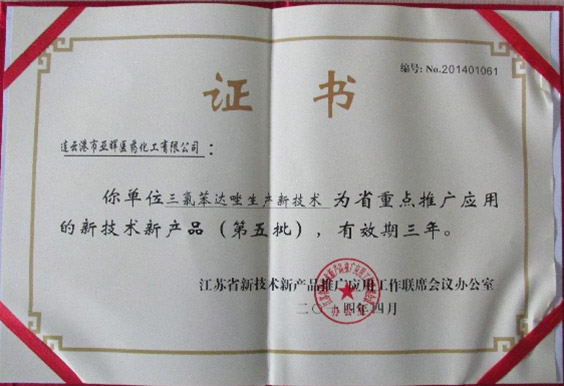 近日,江苏省新技术新产品推广应用工作联席会议办公室下发《关于印发省重点推广应用新技术新产品名录(第五批)的通知》。连云港市亚晖医药化工有限公司的三氯苯达唑生产新技术,经各市推荐、^论证是省重点组织推广应用的对象,列入《目录》,企业将优先享受省有关政策扶持。