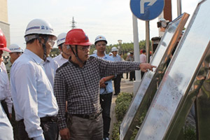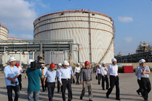 随后,张副省长一行直奔生产现场,在苯乙烯装置现场听取了常州市安全^蒋国松对安全阀的讲解,接着在公用工程装置栈台现场对黄沙应急救援箱开箱检查,在栈台现场对正在卸货的槽罐车司机的相关证件进行了检查,并询问了相关安全操作流程,经过现场检查,张雷副省长对新阳科技的现场安全工作给予了充分的肯定。