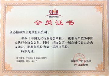 格林保尔荣获中国光伏行业协会“会员证书”