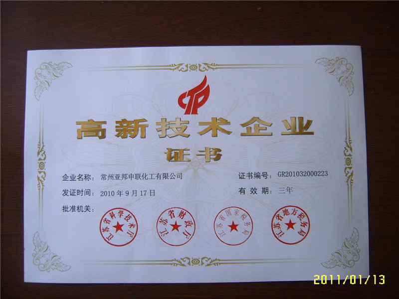 2010年岁末,申联化工荣获江苏省高新技术企业,回顾所走过的路,在2007-2009年经济效益高速增长的过程中,公司始终把 “科技创新,发展企业”作为企业发展的方针,坚持走产、学、研合作的道路,几年来在科技创新上投入近千万,先后与中科院长春应用化学研究所、浙江工业大学等科研院所建立了产、学、研战略合作关系。