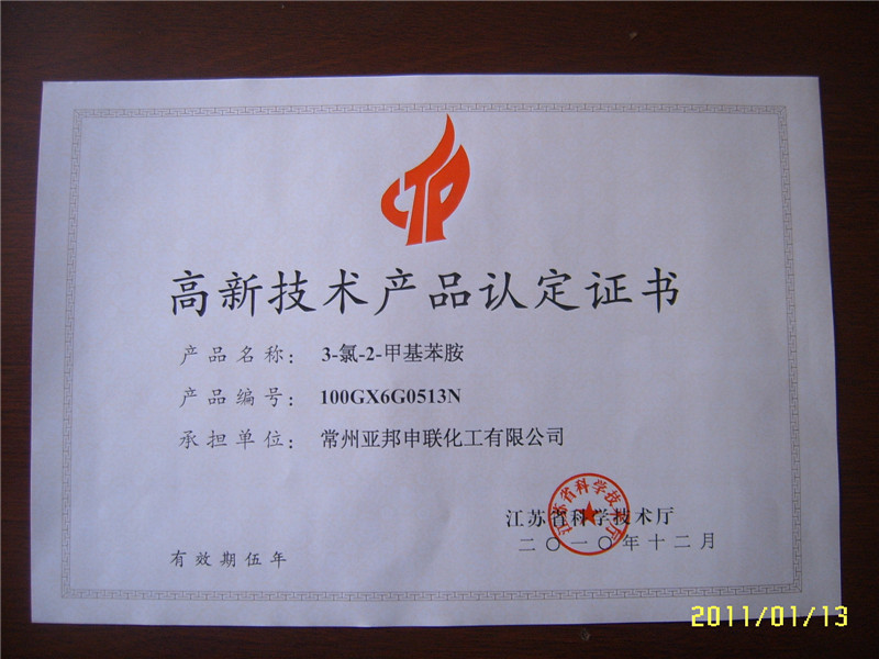 由于坚持走科技创新、技术发展的道路,经过几年的积累,取得了科技成果,在2010年荣获江苏省高新技术企业;3-氯-2-甲基苯胺分别获得江苏省和常州市高新技术产品;成功申报“一种制备6-氯-2-硝基甲苯的方法”^;公司的产、学、研联合创新项目获得常州市扶持民营经济发展专项资金补助;一项项科技成果的取得,标志着公司迈开了科技创新坚实的步伐。