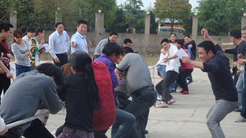 28日下午,首先开场的是拔河比赛,篮球场上人声鼎沸,气氛热烈,大家都紧张的关注着赛场,忘情的高呼“加油”,一根粗粗的大麻绳被慢慢拽向强大的一方。看着场外激动的表情,队员因用力而胀红的面庞,让我们深深的感受到员工的责任感和团队的凝聚力!跳绳是女生的强项,在停车场前的空地上,各部门参加比赛的女将汇集一起,一根根细细的绳子在快速的飞舞着,像一曲曲欢快跳动的音符,将欢乐留在了这个难忘的“五·一”。 掼蛋比赛同时在职工食堂开赛,各位参赛选手冷静思考,沉着应战,都纷纷使出浑身解数,一决高低。