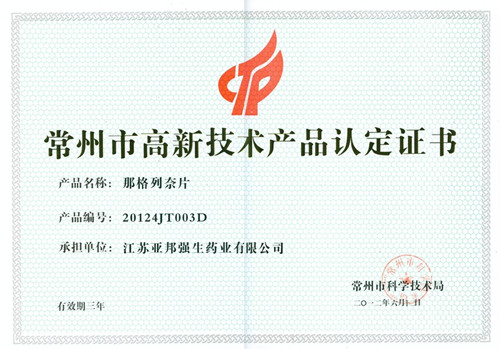 强生药业非那雄胺胶囊和那格列奈片两个产品,经常州市科学技术局^评审,于6月荣获2012年常州市高新技术产品认定证书!