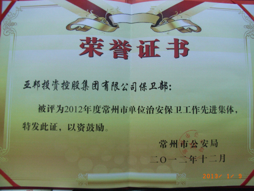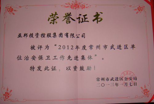 2012年,集团公司保卫部在公司领导高度重视和正确领导下,在各级公安机关的指导下,通过全体保卫队员的共同努力,紧紧围绕全市发展大局,以“十八大”安保为主线,以“平安企业”创建为载体,深入贯彻《企业事业单位内部治安保卫条例》,大力推进公司内部“人防、技防、设施防建设”,织密公司内部治安防控网络,保证了公司的安全平稳运行。2012年度保卫部分别被常州市公安局、武进区公安局再一次评为“单位治安保卫工作先进集体”, 保卫部长余进良授予“单位治安保卫工作先进个人” 荣誉称号。这已是保卫部连续6年获得市公安局、区公安局的表彰。