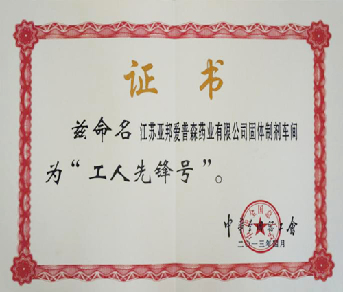 “五一”期间,亚邦爱普森药业有限公司被中华全国总工会授予全国“工人先锋号”光荣称号。“工人先锋号”,是指各类企事业单位中为推动社会发展做出突出贡献,并具有时代性、先进性和示范性的车间、工段、班组等集体,以发展先进生产力、促进社会进步、服务人民群众为重点,以创^工作、^服务、^业绩、^团队为内容,通过广泛深入开展创建“工人先锋号”活动达到提高职工劳动技能、增强职工创新意识、提升职工综合素质、引导职工立足本职、爱岗敬业,刻苦学习、忘我工作,不断进取、甘于奉献的目的。