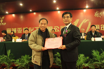 宣城亚邦十年的发展凝聚了全体员工的心血。在庆典活动上,颜料界老^张惠兴先生荣获“特别贡献奖”。普通岗位辛勤付出十年的老员工徐萱兰、陈金龙荣获“十年奉献奖”。宣城亚邦总经理张华、副总经理钟建权分别为获奖者颁奖。
