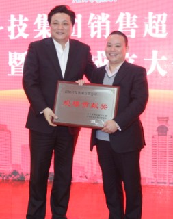 市委常委、常务副市长韩九云向新阳科技集团颁发“规模贡献企业”奖牌。