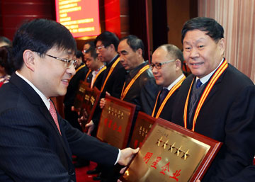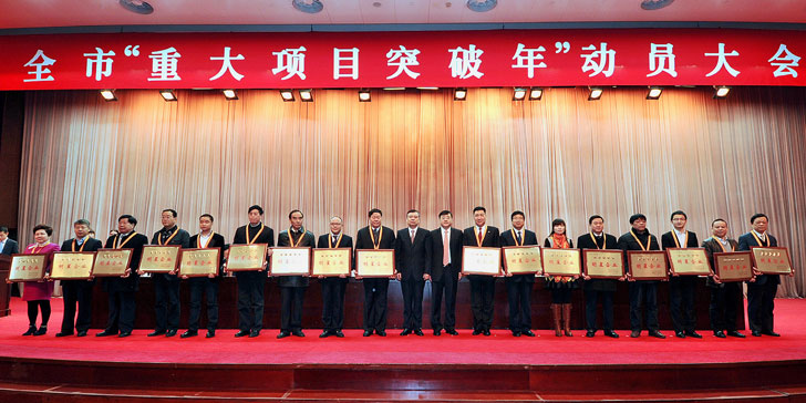 新春上班第一天,常州市委、市政府隆重召开“重大项目突破年”动员大会。会议发出“以铁的决心奋力打赢重大项目攻坚战”动员令。会上,市委、市政府表彰了2013年度全市“创新争星 做强做大”活动优胜企业和^企业家,我集团公司荣获全市“工业五星企业”第一名,同时获“重大贡献奖”和“销售规模奖”。我司所属企业新阳科技集团同时获得表彰,荣获“工业五星企业”称号,并获“销售规模奖”。许小初董事长和新阳科技集团董事长张文俊被评为全市“杰出企业家”,获得市委、市政府的表彰。市委书记阎立、市长费高云分别为许小初董事长颁奖,并与许董事长亲切握手表示祝贺。