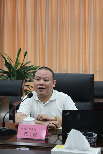 在六楼会议室,张文俊董事长首先给客人观看了新阳科技集团的宣传片《新阳梦 中国梦》,并介绍了新阳科技集团的情况:新阳科技集团成立于2013年10月,是以新阳科技集团有限公司(原常州新日化学有限公司)为母公司,以常州新日催化剂有限公司、常州市长江热能有限公司、常州新阳新材料科技有限公司、常州新阳投资有限公司、常州新红贸易有限公司5家公司为控股子公司;以常州东昊化工有限公司、常州新日新材料有限公司、常州亚邦化学有限公司、江苏亚邦涂料股份有限公司、漳州亚邦化学有限公司、天津亚邦化学有限公司、江苏格林保尔光伏有限公司、大丰格林保尔光电有限公司、新阳(大丰)经济贸易有限公司、常州新日贸易有限公司、漳州福海林业有限公司、新湖(常州)石化有限公司、常州东昊科技开发有限公司13家公司为成员企业组建而成的集团。