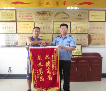 7月13日下午,灌南申通快递公司的负责人陈雷一行四人,为表示对染料连云港分公司保卫人员见义勇为、高尚品德的感谢,特制作了锦旗专程送来,保卫部长张青山代表保卫人员接受了锦旗。